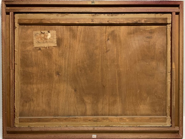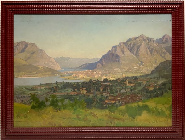 "Lecco, levata del sole" olio su tavola (cm 68x95) Firmato in basso a destra. Al retro: tracce di cartiglio. In cornice