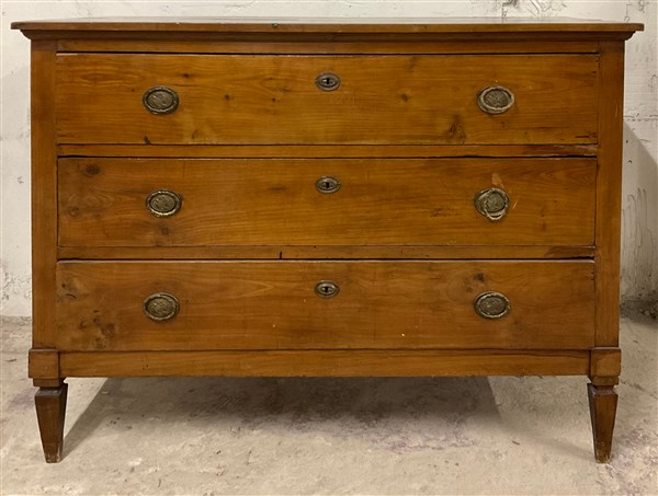 Comò "Luigi XVI" con fronte a tre cassetti, fianchi riquadrati e piedi rastrema