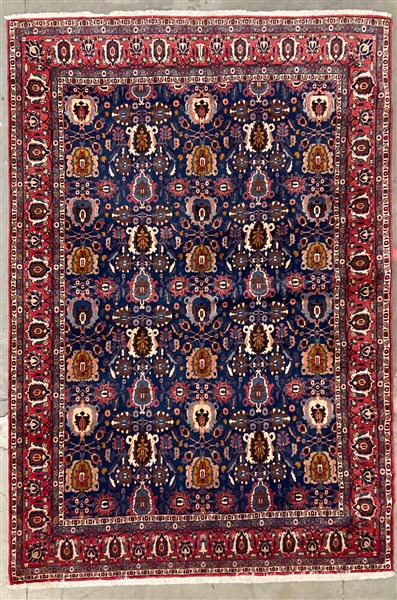 Tappeto Tabriz, Persia, secolo XX. Decoro all over con piccoli medaglioncini policromi su fondo blu. Bordura Herati su fondo rosso.(Lievi difetti) (cm 315x220)
