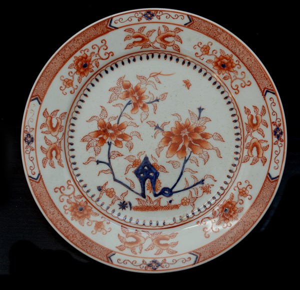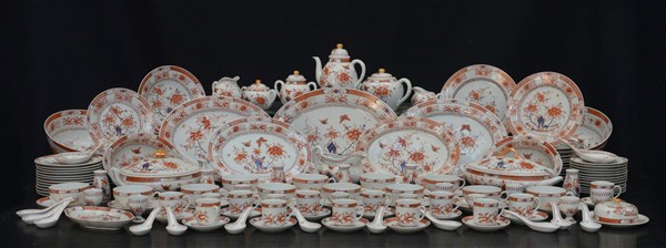 Servizio per dodici persone in porcellana di Macao (Cina), sec. XX; decorato a motivi floreali rosso e blu; composto da: dodici piatti piani, dodici piatti fondi, dodici piatti da frutta, dodici piatti da dessert, dodici piatti da antipasto, sei piatti da portata ovali, due ciotole tonde, due ciotole ovali, due zuppiere con coperchio, dodici portauova, tre porta sale, tre porta pepe, dodici cucchiaini da soia piccoli e due grandi, dodici tazze da tè con piattini, dodici tazze da caffè con piattini, una teiera, una lattiera e una zuccheriera; una caffettiera, una lattiera, una zuccheriera e un porta burro. Per un totale di 162 pezzi.