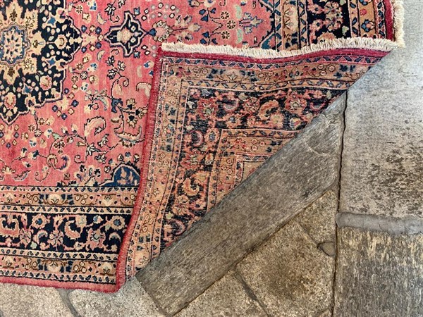 Tappeto Keshan, Persia, secolo XX. Decoro con piccolo medaglione blu su campo rosa cosparso di rami fioriti (cm 281x195) (difetti)