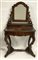 Toilette in palissandro lastronato, intarsiato e filettato in legno chiaro a volute, motivi vegetali e figure mitologiche. Cassetto sottopiano, alzata con due cassettini alla base e specchio basculante, gambe mosse unite da traversa tornita (cm 83x141x ) secolo XIX (difetti e mancanze)