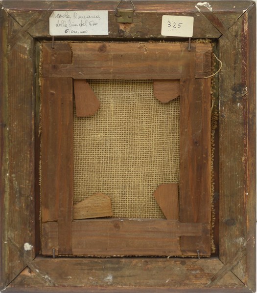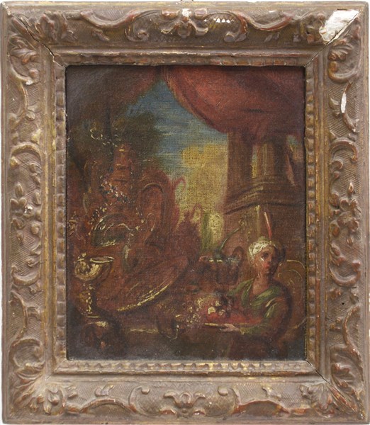 Scuola della fine del secolo XVII - inizio XVIII "Scena di banchetto con servitore" frammento ad olio su tela (cm 20x15,5). In cornice in legno intagliato