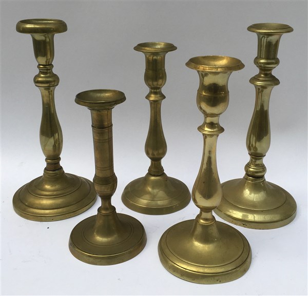 Lotto composto da cinque candelieri in ottone con base circolare. Epoche diverse (h. max cm 25,5) (lievi difetti)
