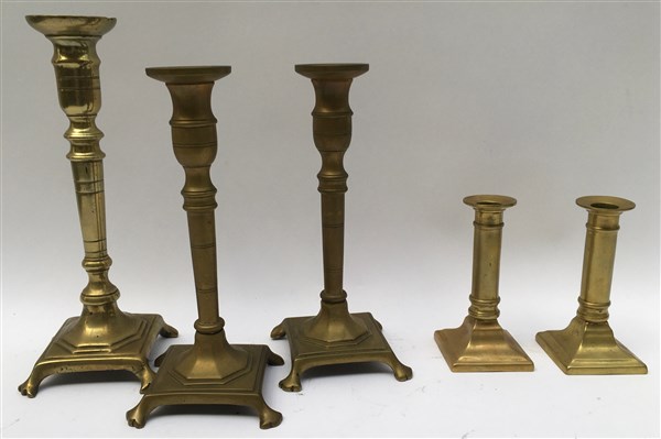 Lot 1514 | Lotto composto da cinque candelieri in metallo a base quadrata. Epoche diverse