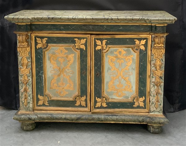 Credenza in legno laccato a finto marmo e dorato, due ante sul fronte decorate a volute e motivi fogliati, montanti scolpiti e dorati, piedi a cipolla. Secolo XIX (cm 165x125x54) (difetti e restauri)