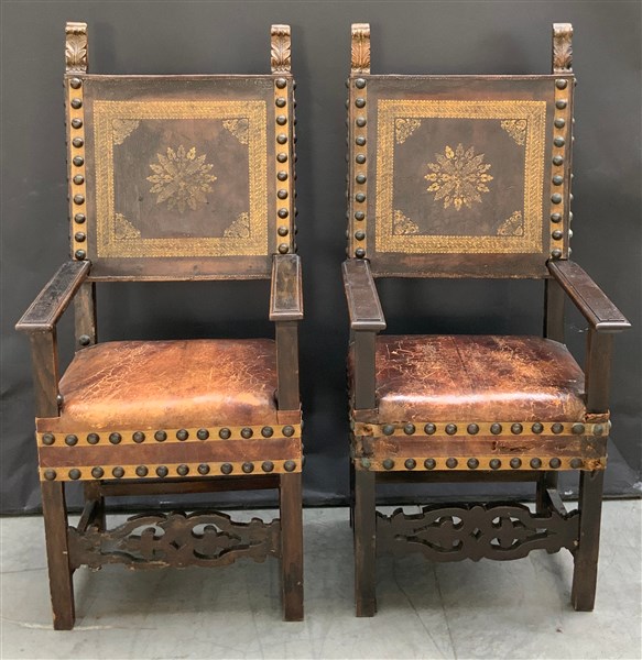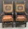 Coppia di seggioloni in legno con seduta e schienale rivestiti in pelle impressa in oro. Puntali intaglati e dorati, sec. XVII (difetti, mancanze e restauri)