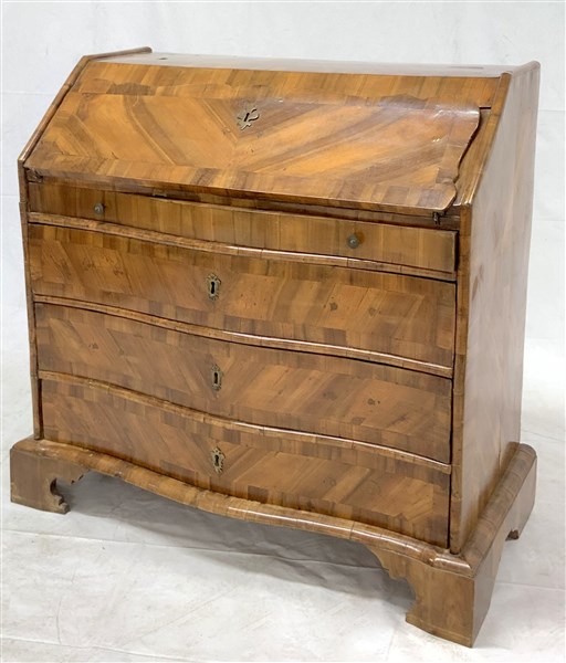 Ribalta lastronata in noce con fronte di forma mossa a tre cassetti sotto uno a mezza lunghezza, la calatoia rivela quattro tiretti e un vano. Secolo XVIII (cm 115x106x57) (difetti e restauri)