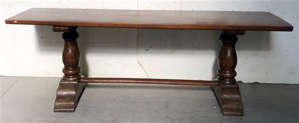Tavolo in legno con piano di forma rettangolare, gambe a colonna tornita riunite da traversa dritta, piedi sagomati (cm 238x80x71) (difetti)