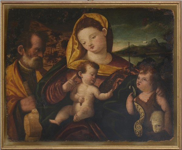 Scuola veneta "Sacra Famiglia con San Giovannino" antico dipinto ad olio su tavola (cm 50x64 circa). In cornice a teca