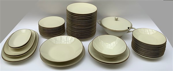 Manifattura di Rosenthal, parte di servizio in porcellana bianca con profilo in oro composto da ventitre piatti piani, dodici fondi, undici piattini da frutta, una zuppiera con coperchio, un'insalatiera e nove piatti da portata diversi, epoche diverse (lievi difetti)