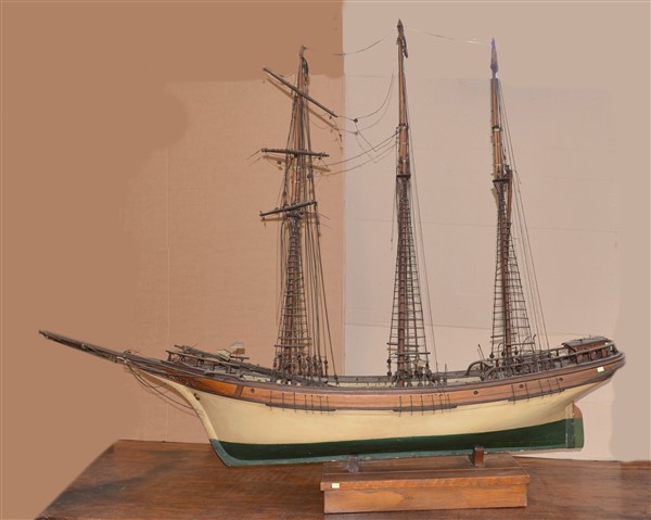 Modello di brigantino a palo in legno. Prima metà secolo XX (cm 148x26x113) Su base in legno (difetti e mancanze)