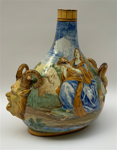 Manifattura di Castelli, fine sec XIX Fiasca da pellegrino in maiolica policroma decorata a scene classiche con amorini