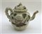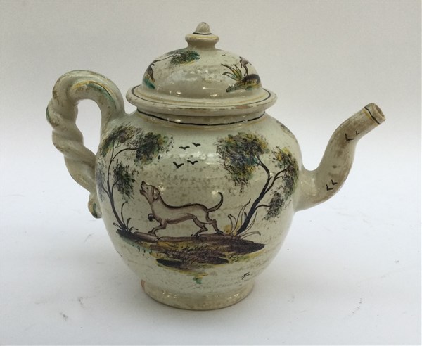 Manifattura di Faenza, tiera con coperchio in maiolica decorata a paesaggi in policromia impugnatura a torciglione, secolo XVIII (h cm 16) (restauri)