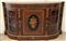 Credenza scantonata lastronata in radica, anta centrale, fascia superiore e montanti decorati da riserve ebanizzate intarsiate a motivi floreali, ante laterali in vetro. profili e fregi in bronzo dorato e cesellato (cm 177x108x43) (difetti)