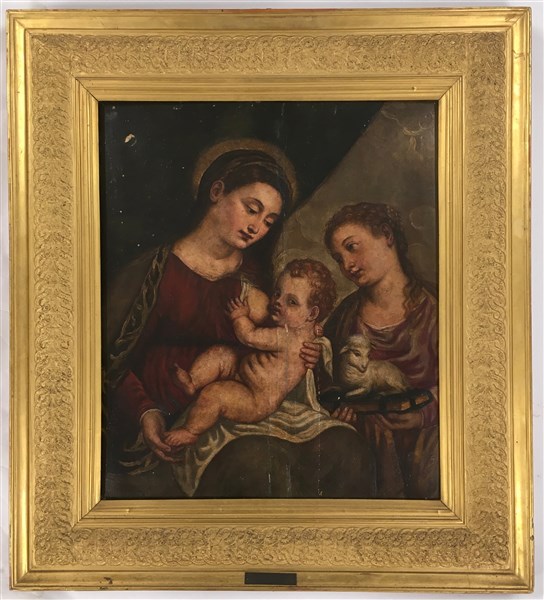 Scuola veneta del secolo XVII "Madonna che allatta il Bambino con Santa Agnese" olio su tavola (cm 49x41). In cornice in legno intagliato