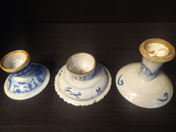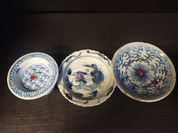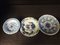 Tre alzatine in porcellana bianca e blu decorate, una con drago e le altre due motivi floreali (difetti)