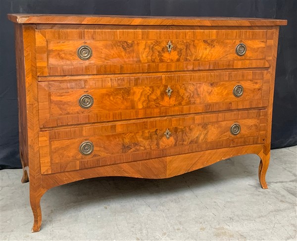 Cassettone lastronato e filettato in legni vari, fronte a tre cassetti e gambe mosse. Fine secolo XVIII (cm 130x93x62) (difetti e mancanze)