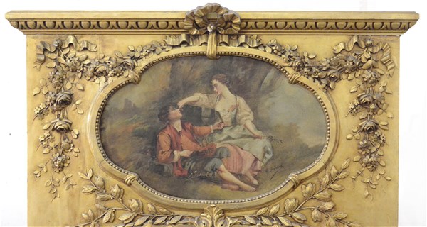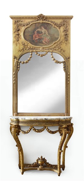 Consolle con specchiera in legno intagliato e dorato. Specchiera intagliata a festoni floreali e vegetali, nastro e volute decorata da dipinto ad olio su tela raffigurante scena galante; console di forma sagomata scolpita a festoni floreali, riccioli e volute, traverse decorate al centro da vaso a tutto tondo, piano in marmo (consolle cm 105x92x46)(specchiera cm 170x107) (difetti)
