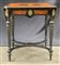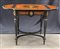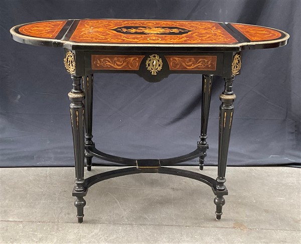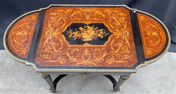 Tavolino ad alette da centro con piano sagomato, cassetto sottopiano e finto cassetto sul lato opposto riccamente intarsiato a volute, motivi vegetali, filettature e medaglione centrale, sul piano a motivi floreali frecce e faretra. Guarnizioni in metallo cesellato e dorato sulla fascia. Gambe tornite e scanalate riunite da crociera curvilinea, Francia secolo XIX (cm 71x77x56)