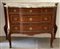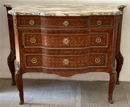 Comò di forma sagomata a tre cassetti lastronato e intarsiato a marqueterie. fregi, profili, maniglie e scarpette in bronzo dorato e cesellato, piano in marmo (cm 126x93x53) (difetti)