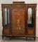 Credenza lastronata a tre ante di cui quelle laterali a vetrina. Anta centrale e fascia superiore decorate da fregi in bronzo dorato e cesellato a motivi neoclassici, montanti decorati da cariatidi, pianetto in marmo (cm 145x163x40) (difetti)