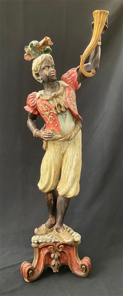 Moro reggitore in legno intagliato, laccato e dorato poggiante su piedistallo tripode con finto cuscino (h cm 171.5) (difetti)