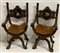 Coppia di poltroncine "Savonarola" in legno filettato in peltro, schienale sagomato decorato da riserve ebanizzate intarsiate in avorio, madreperla e metallo con putti, volatili e mascheroni. Puntali intagliati, gambe sagomate riunite da traverse tornite, Lombardia secolo XIX (difetti e mancanze)