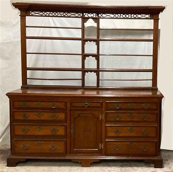 Mobile piattaia inglese filettato in legni diversi a motivi geometrici con parte superiore a giorno e parte inferiore a sei cassetti e due ante. Inghilterra secolo XX (cm 190x202x53) (difetti)