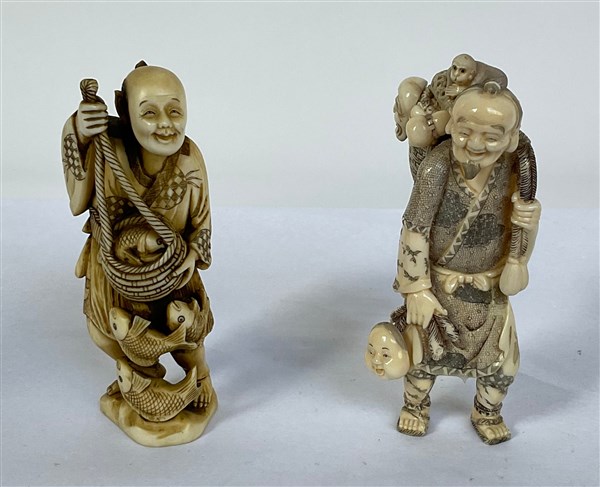 Lotto composto da un okimono con gerla in avorio (difetti) e un okimono in avorio raffigurante pescatore. Giappone, periodo Meiji (1868-1912) (h. max 15,5)