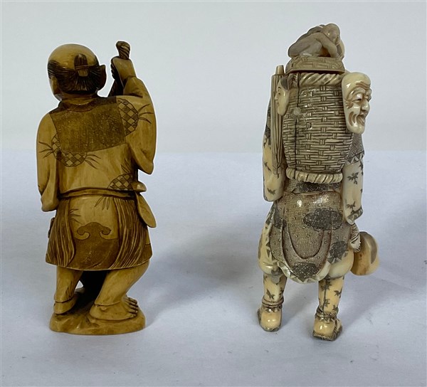 Lotto composto da un okimono con gerla in avorio (difetti) e un okimono in avor