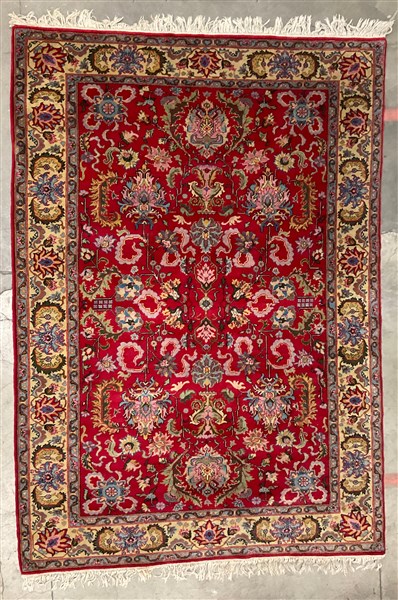Tappeto Keshan, Persia, secolo XX. Decoro all over policromo con vasi fioriti su campo rosso (cm 300x200) (difetti)