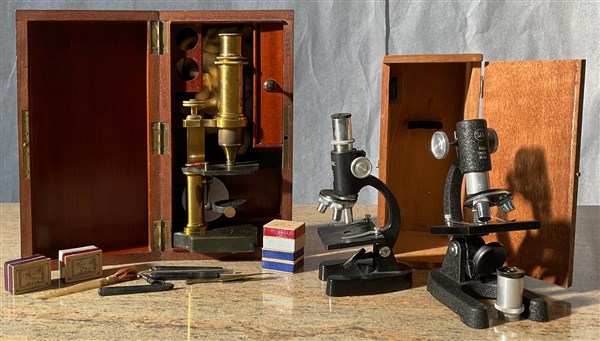 Lotto composto da tre microscopi di cui due di produzione della metà del XX secolo ed uno di fine XIX Secolo in custodia corredato da alcune serie di vetrini (difetti)