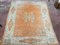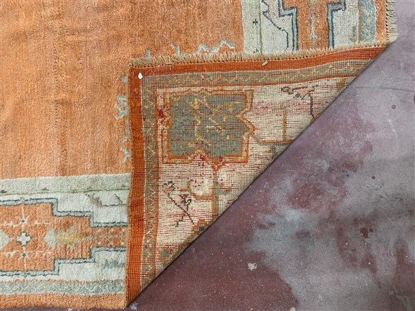 Tappeto Ushak, Anatolia, inizio secolo XX. Decoro con piccolo medaglione floreale bianco su fondo albicocca. Bordura a fondo bianco con cartigli albicocca (cm 291x206) (lievi difetti)