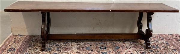 Tavolo in legno da refettorio con sostegni sagomati riuniti da traversa (cm 300x78x75) (difetti e restauri)