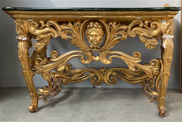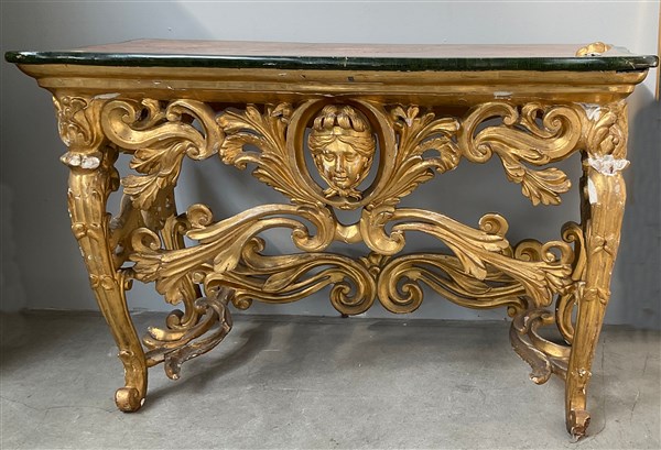 Consolle in legno intagliato e dorato a volute e motivi vegetali,fronte centrato da mascherone, gambe e traverse mosse, piano in legno laccato a finto marmo di epoca posteriore (cm 132x88x69) (difetti, restauri e mancanze)