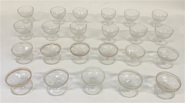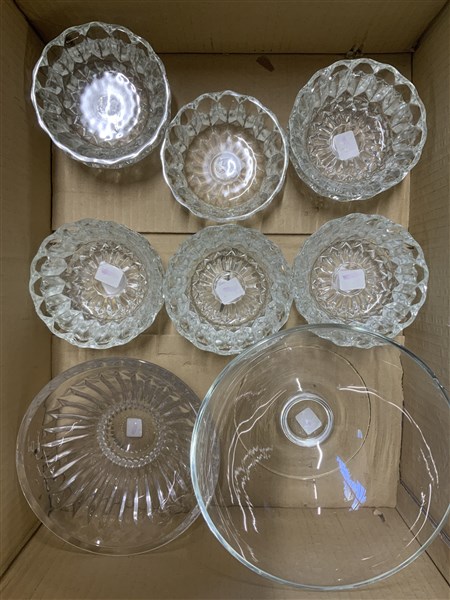 Lotto composto da numerose ciotole da macedonia in vetro e cristallo più due coppe di diverse forme, decoro e misure (difetti)