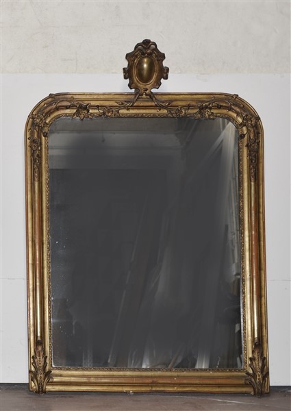 Caminiera in legno e pastiglia intagliato e dorato a motivi vegetali e fiorellini, fregio centrale nella parte superiore, secolo XIX (cm 150x107) (difetti e mancanze)