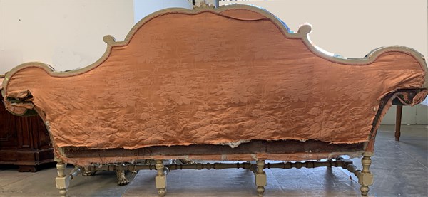 Divano ad orecchioni in legno intagliato laccato e dorato. Fronte leggermente m