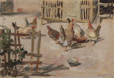 PRIVATO COSIMO Venezia 1889 - 1971 Galline nell'aia olio su cartone cm 35x50...