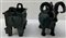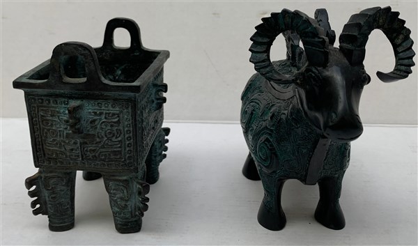 Lotto composto da un modello di versatoio in forma arcaica in bronzo e una scatola in bronzo con coperchio a forma di ariete. Cina, sec XX (lievi difetti)