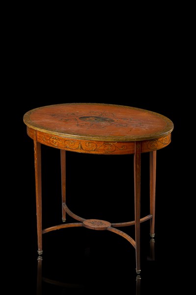 Tavolo da centro in mogano centrato da ovale entro riserve stilizzate, gambe squadrate unite da traverse. Inghilterra, secolo XIX (cm 74,4x69,5x48) (difetti)