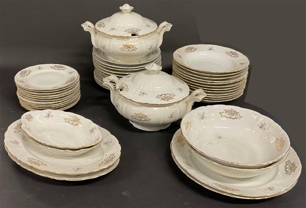 Manifattura Cecoslovacca, servizio di piatti in porcellana decorata a fiorellini policromi e fregi dorati composto da: due zuppiere, due insalatiere, sei piatti da portata diversi, dodici piatti piani, dodici piatti fondi e dodici piatti da frutta (lievi difetti)