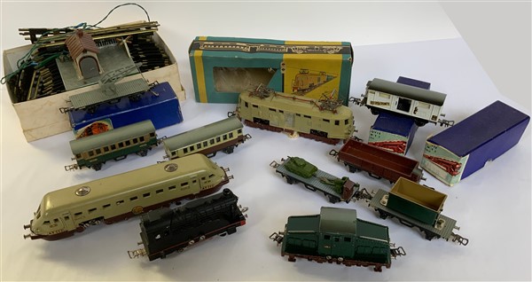 Lotto composto da numerosi trenini, binari e componenti per plastici ferroviari di diverse marche ed epoche (difetti)