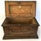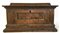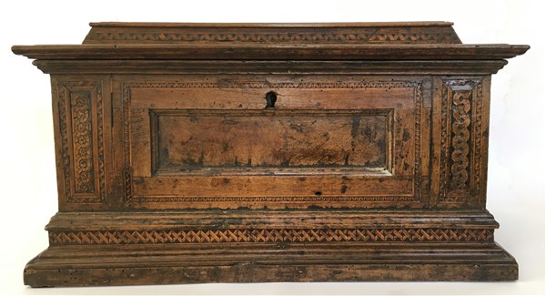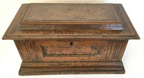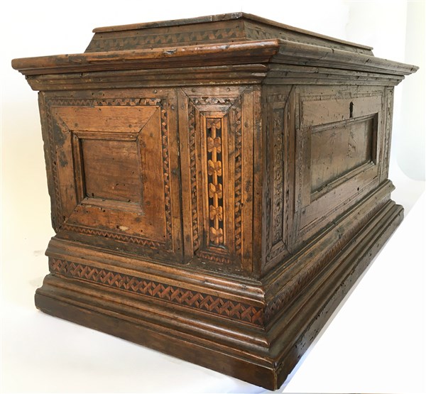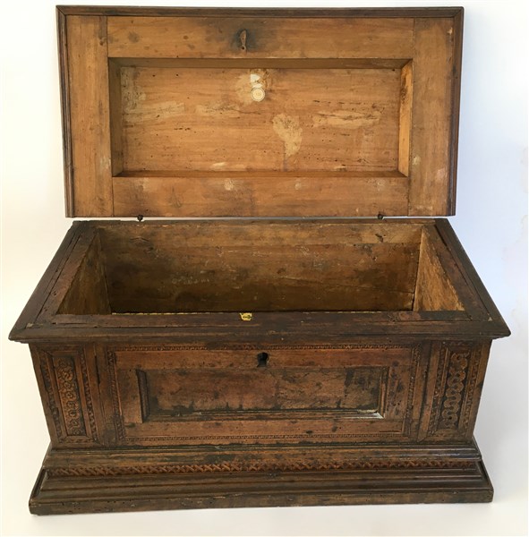 Piccola cassapanca in noce filettato e intarsiato a motivi geometrici (cm 70x38x36) (difetti e mancanze)