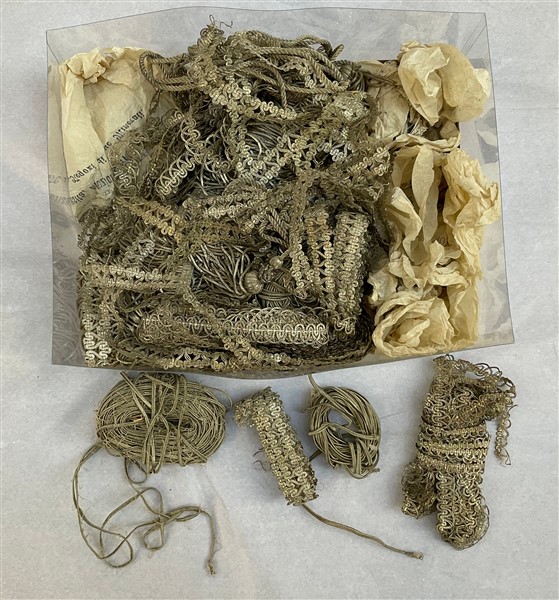 Lotto composto da vari pezzi di bigiotteria, pezzi di cintura e passamaneria color argento (difetti e mancanze)