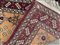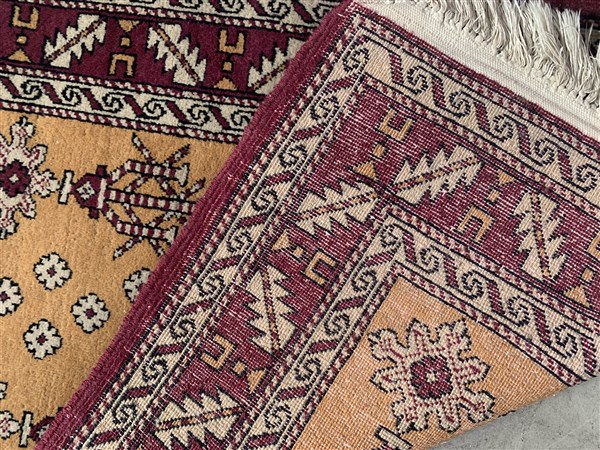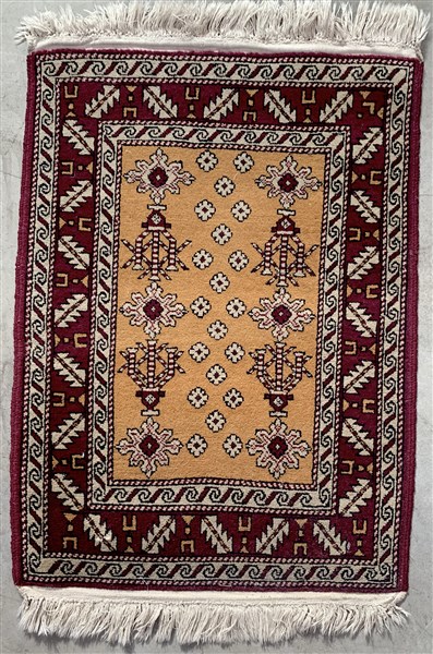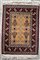 Tappeto Karabagh, Caucaso, inizio secolo XX. Decoro geometrico nei toni del ciclamino, bianco e marrone su fondo cammello. Bordura a foglie dentate e calici su fondo ciclamino (Lievi difetti) (cm 77x56)