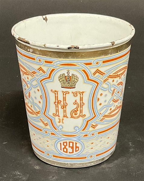 Bicchiere commemorativo in ferro smaltato e dipinto in policromia. Oggetto utilizzato per celebrare la salita al trono dello zar di Russia Nicola II Romanov (1868- 1918). Furono prodotte numerose copie, almeno un migliaio, di questo bene che venne spesso utilizzato come portamatite. Manifattura russa, fine secolo XIX (h cm 10) (difetti)