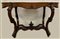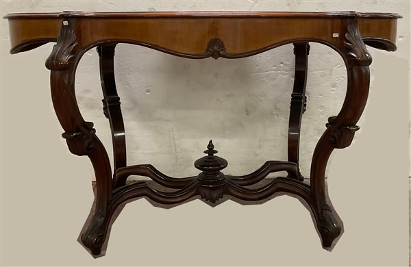 Tavolo a biscotto in legno intagliato, piano sagomato, gambe mosse riunite da crociera con pinnacolo tornito (cm 137x77x78) sec. XIX (difetti)