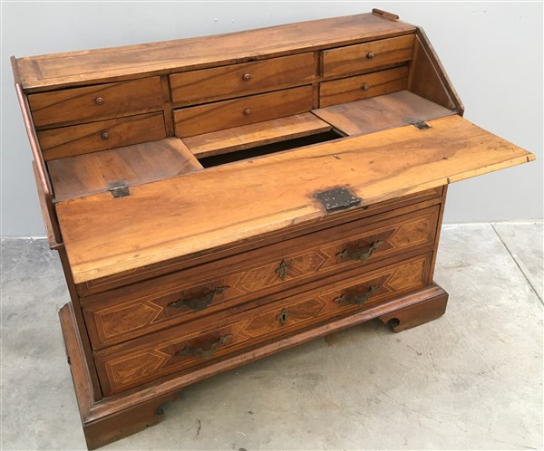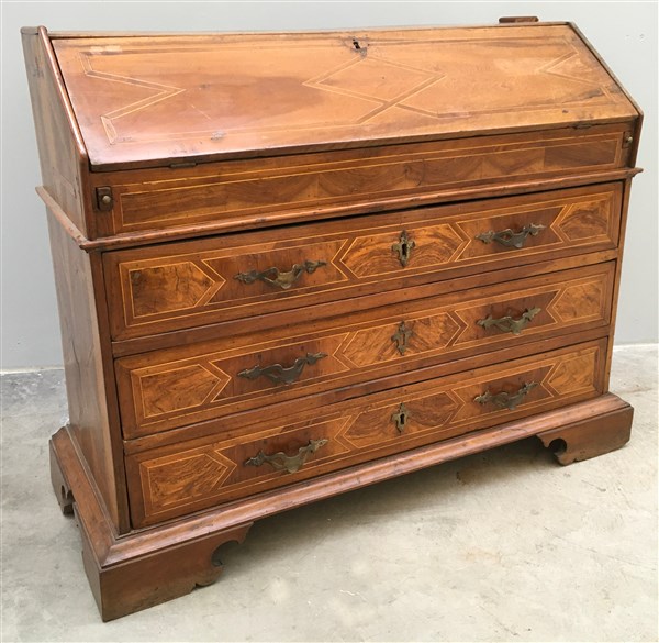 Antica ribalta lastronata e filettata con inserti in radica, fronte a tre cassetti e piedi a mensola. (cm 116x98x52) (difetti e mancanze)